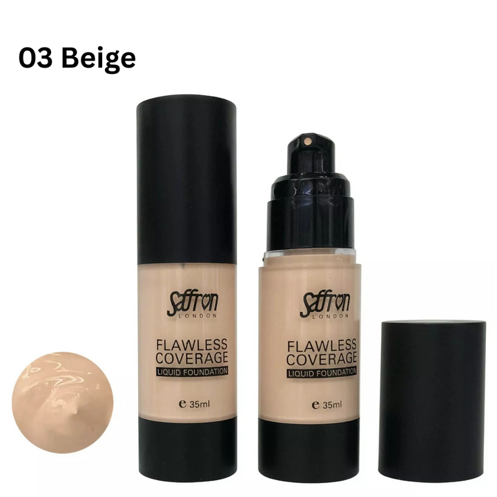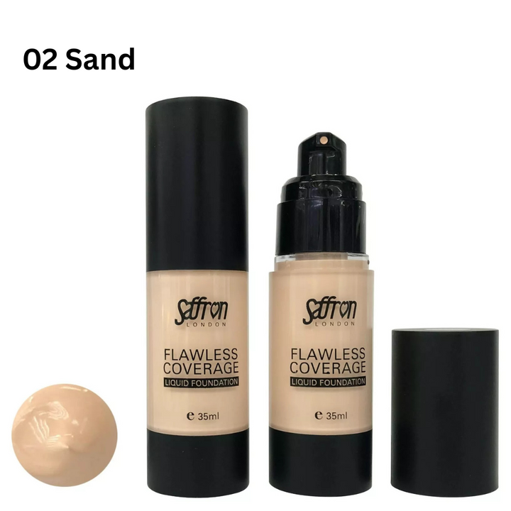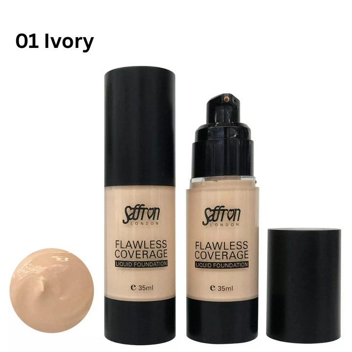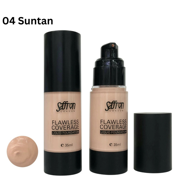 - Saffron Flawless Liquid Face Foundation, provides buildable coverage and gives a glowing, satin finish.
