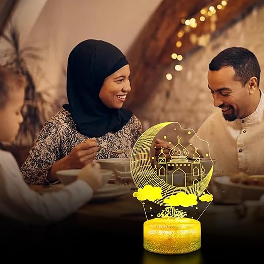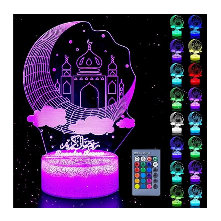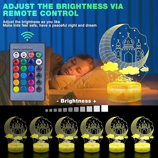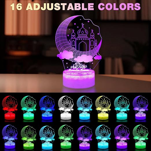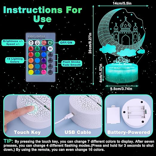 The Meetory LED Night Light offers versatile illumination with 16 color options controlled via remote, allowing precise ambiance adjustment for any setting. Powered by USB or battery, it ensures flexible placement on tables or desks without wiring constraints. Its touch-sensitive design provides easy operation, while the 3D lamp effect adds a stylish, modern aesthetic. Ideal for home use, parties, or Ramadan celebrations, this night light combines functionality with decorative appeal to enhance your environment effortlessly.