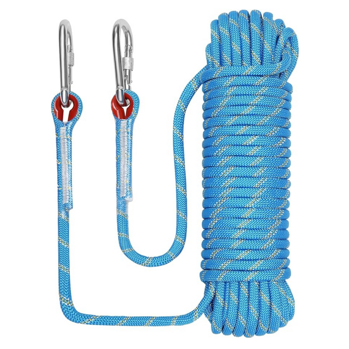 - This rope is made of Nylon(innner) and Polyester(outer). Ultimate tensile force: 20KN(4,496lbs, 2,000KG); Working tensile force: 15KN(3,372lbs, 1,500KG); Diameter: 10 mm; Cable Length: 10 Meters; Color: Reflective Blue. Package come with: 1 x rope, 2 x solid big iron carabiner, 1 x drawstring rope bag.