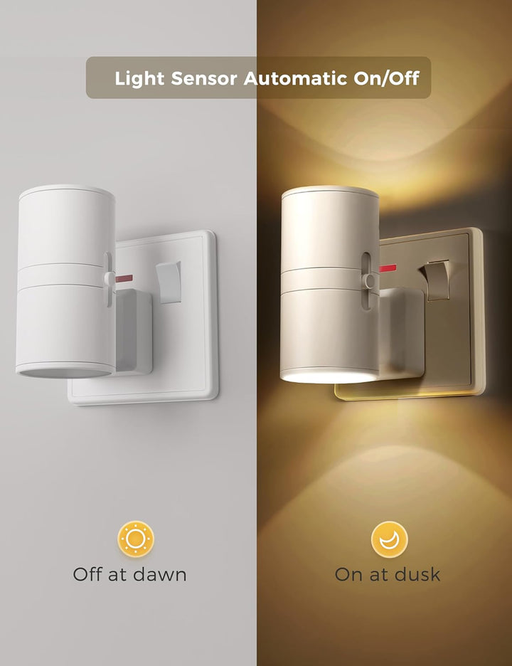 - Plug in Night Light -- With a dusk to dawn photocell sensor, this night light can automatically turn on at night and turn off in the daytime.