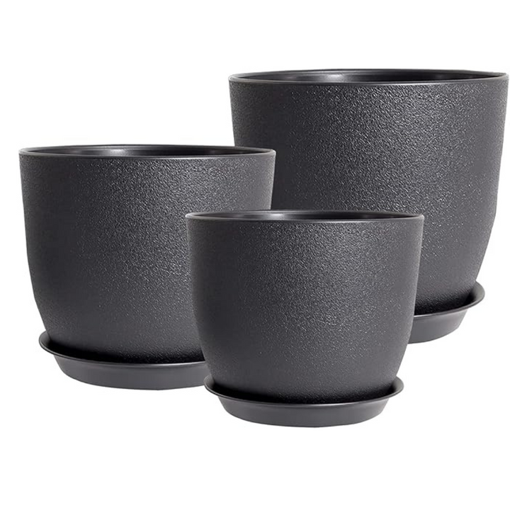 This set of three modern black plastic plant pots includes sizes of 20cm, 18cm, and 16cm, each designed with drainage holes to prevent waterlogging and promote healthy root growth. Accompanied by matching saucers, these planters protect surfaces from excess water while adding a sleek, contemporary touch to your indoor or outdoor garden. Durable and lightweight, they offer practical functionality combined with stylish design for versatile plant display.