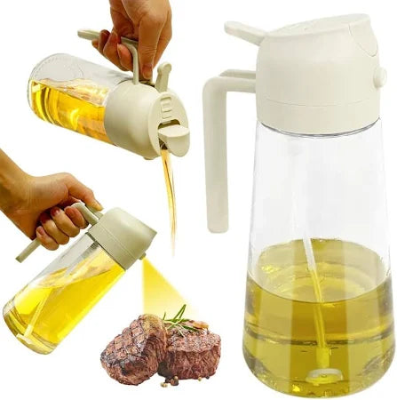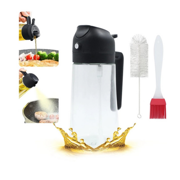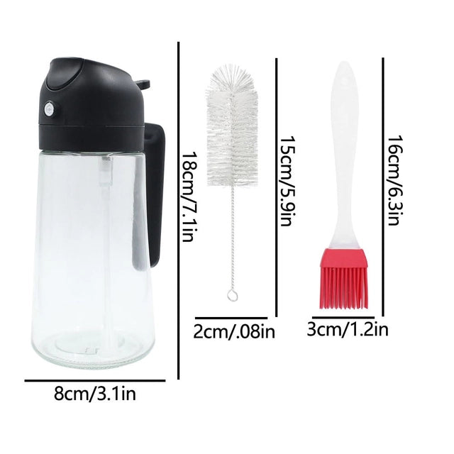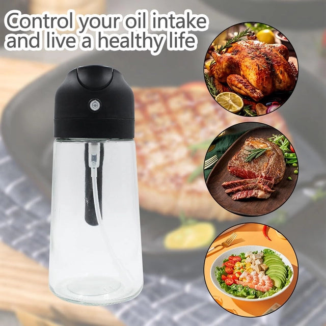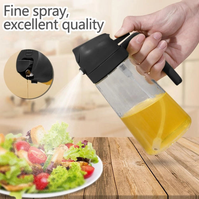 - This spray oil bottle is made of glass and food-safe PP material. The smart design of the glass bottle makes it easy to see how much seasoning is left and to identify the seasoning in the bottle. The 2-in-1 split oil bottle and oil sprayer can both spray and pour oil, you can switch between the two functions at any time.