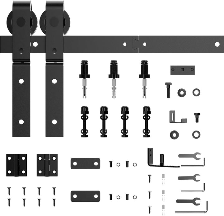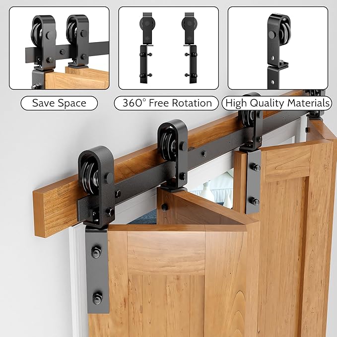 - [Excellent Product Quality] SANKEYTEW bi-folding barn door hardware kit is made of high-quality carbon steel, which is not easy to bend or deform. The surface has a black coating, which is rust-proof and beautiful.The rollers use a high-quality bearing and nylon combination to minimize friction and ensure quiet and smooth sliding.