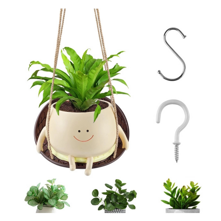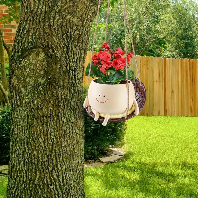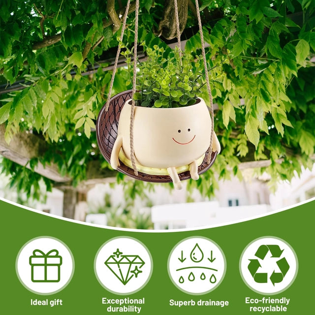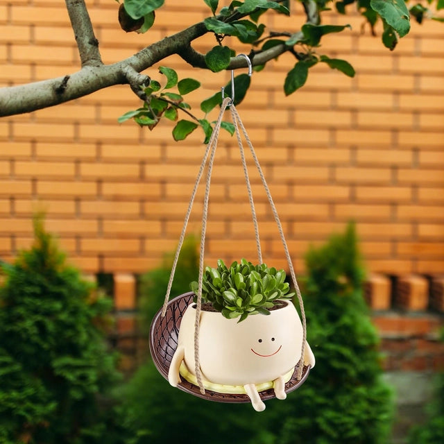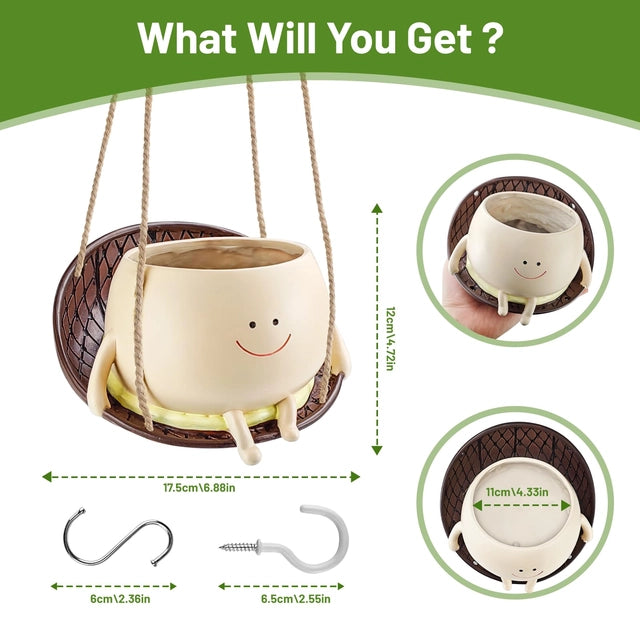 Elevate your indoor or outdoor garden with the Swing Smile Face Planter Pot. Crafted from durable resin, this small hanging plant pot features a charming smile face design and a unique swing chair shape, perfect for showcasing succulents or small plants. Its playful yet sturdy construction makes it an ideal gift for plant enthusiasts, combining decorative appeal with practical use. Suitable for any space, it adds a touch of whimsy while supporting healthy plant growth.