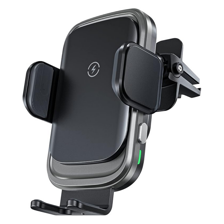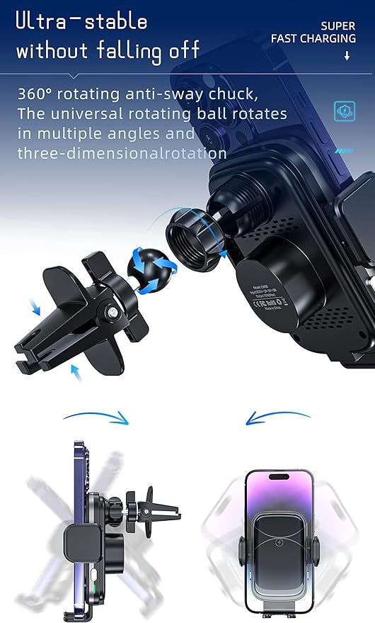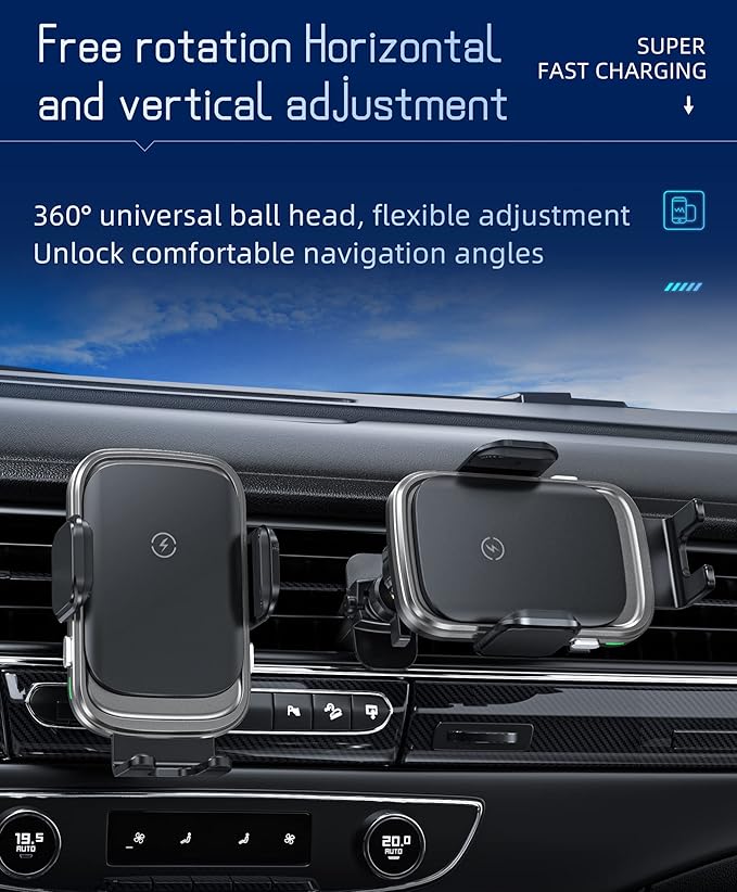 The Tigratigro Qi Wireless Car Charger delivers efficient 15W fast charging while securely holding your phone with its advanced anti-shock system. Designed for convenience, it offers 360° free rotation, allowing optimal viewing angles for safer driving. This charger combines reliable power delivery with stability, ensuring your device stays charged and accessible on every journey.
