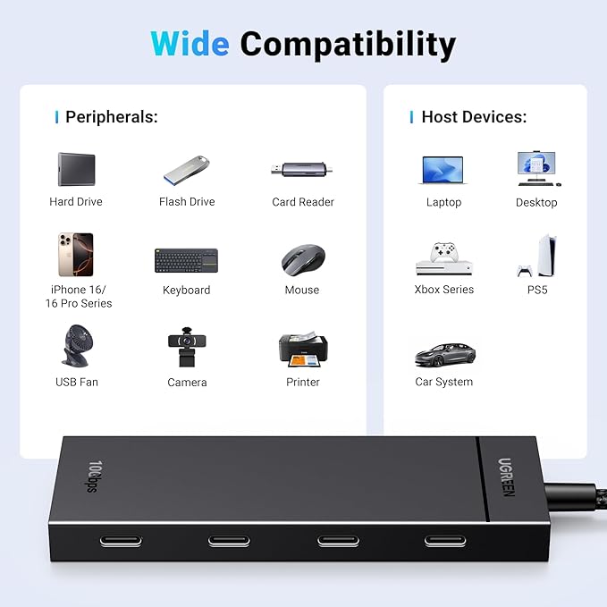 - 4 USB C Ports: The UGREEN USB C Hub can expand the USB C port of the laptop into 4 USB C ports. It can connect all the USB peripherals in your daily work, such as: U disk, hard disk box, card reader, keyboard and mouse, printer, etc