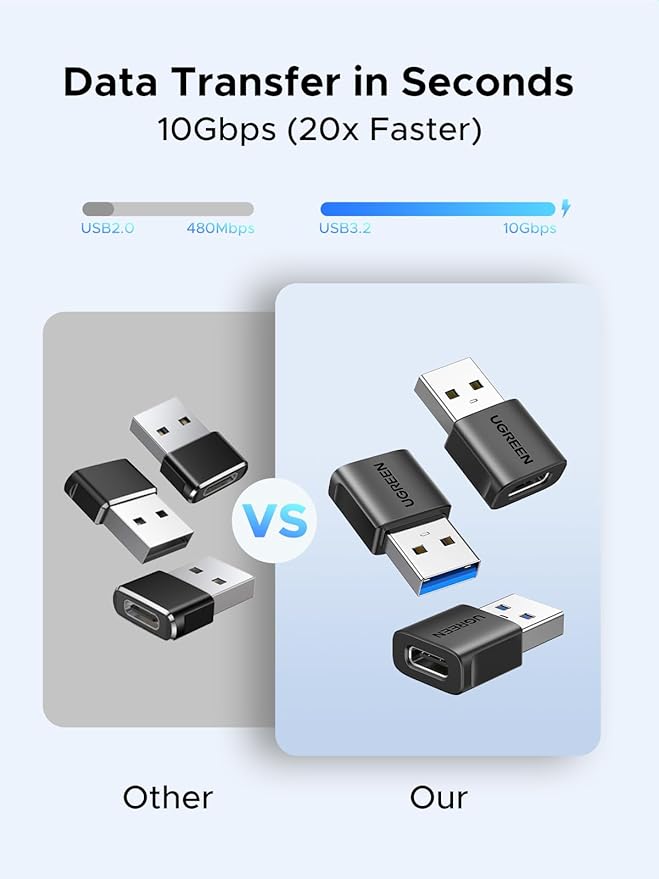 - 10Gbps High-Speed Data Transfer: This USB to USB C Adapter supports blazing-fast data transfer up to 10Gbps (USB 3.2 Gen 2), doubling the speed of USB 3.0. Ideal for transferring large files between laptops, phones, and USB-A/USB-C devices. (Note: To reach a speed of 10Gbps, your device must support 10Gbps transmission speed, and the data cable connecting to the product cannot exceed 1M.)
