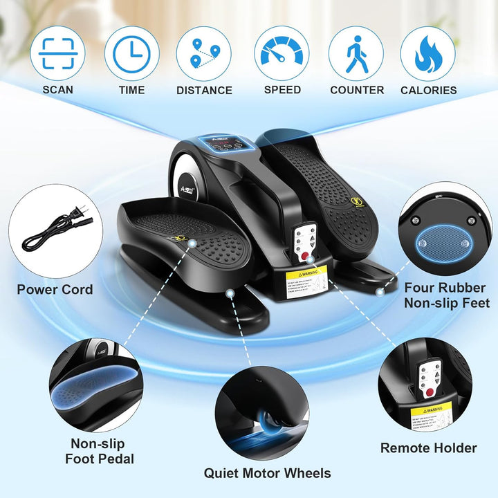 - 【Auto & Manual Modes】The seated elliptical trainer for desk exercise offers 2 different modes depending on your needs. Auto (P1/P2/P3) and Manual (5-step speed, from 1.5KM/h to 5.7KM/h) for your choice. The pedals can be moved forward or backward to exercise different muscles. Tips: Just stay seated and enjoy pedalling. No assembly required. (TIPS: The actual elliptical machine and the brand printed on the packaging are the same as those photos shown on the detail page.)