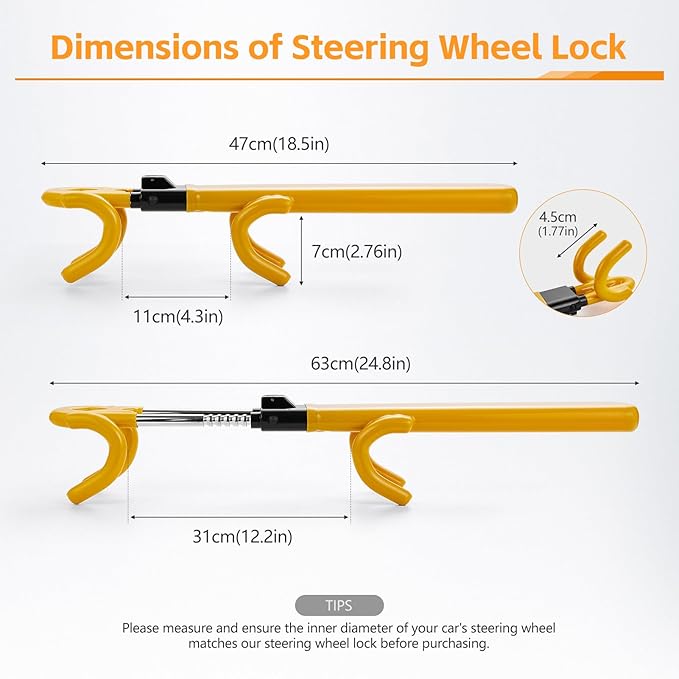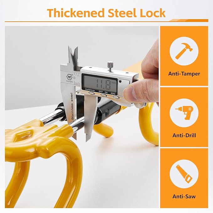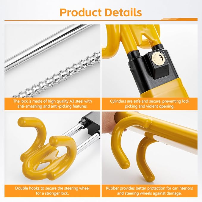 - 【Dual Bar & Dual Hook Design】Our steering wheel lock is crafted from durable stainless steel with a robust double-bar design, this steering wheel lock offers superior securing power. Its increased weight and enhanced theft resistance make it a reliable safeguard for your vehicle. The outer surface is coated with a soft anti-scratch layer, ensuring your steering wheel, horn, and logos remain scratch-free. Elevate your vehicle's security with this protective and practical anti-theft solution.