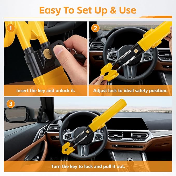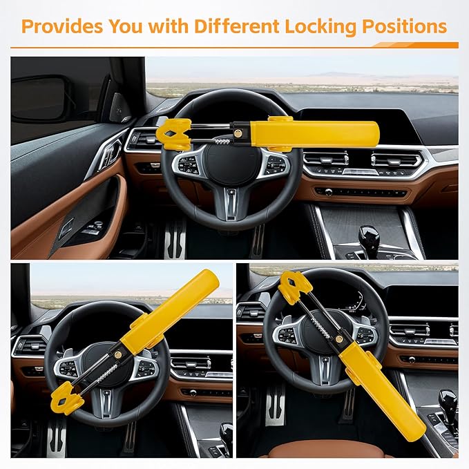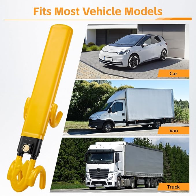 - 【High Visibility Yellow Design】The car steering wheel locks of this car is in bright yellow, which has a powerful visual deterrent effect, making potential thieves think twice before aiming at your car. It effectively protects the property of car owners and provides reliable anti-theft security.