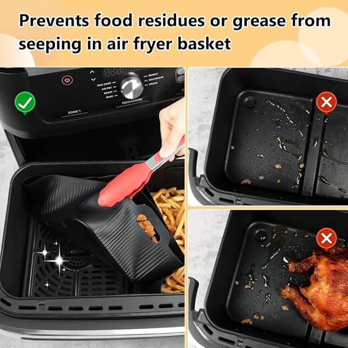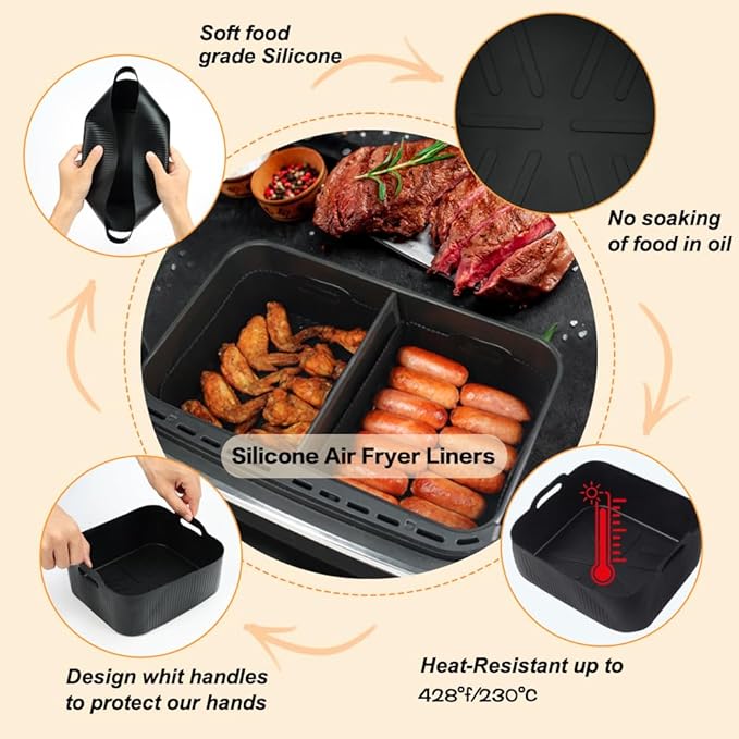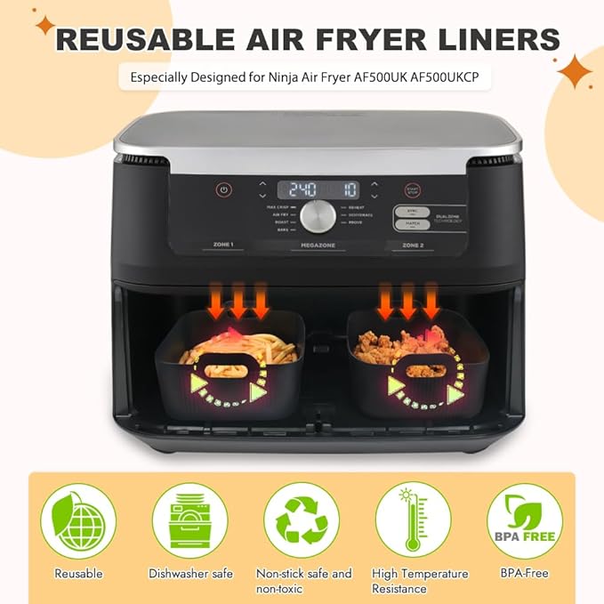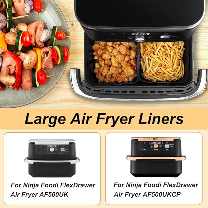- SILICONE AIR FRYER LINERS FOR NINJA AF500UK: The air fryer inserts specially designed for Ninja Foodi Flexdrawer Dual Air Fryer 10.4L AF500UK/AF500UKCP. With a larger capacity and package including 2pcs 5.2L Ninja dual air fryer liners , these ninja air fryer accessories are tailored to elevate your air frying experience.